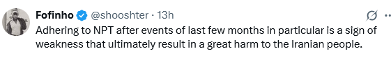 این پی ٹی پر قائم رہنا، خاص طور پر گذشتہ چند مہینوں کے واقعات کے بعد؛ کمزوری کی علامت ہے، جو بالآخر ایرانی عوام کے لئے بہت زیادہ نقصان کا باعث بنے گا۔