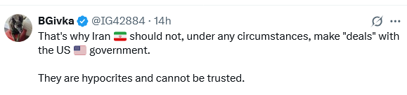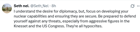 میں سفارتکاری کی (ایرانی) خواہش کو سمجھتا ہوں، لیکن، اپنی جوہری صلاحیت کو بڑھانے اور ان کی سلامتی کو یقینی بنانے پر توجہ مرکوز کریں۔ کسی بھی خطرے کے خلاف اپنے دفاع کے لئے تیار رہیں، خاص طور پر کنیسٹ (اسرائیلی پارلیمنٹ) اور کانگریس (امریکی پارلیمنٹ) میں موجود جارح شخصیات کی جانب سے۔ یہ سب منافق ہیں!
