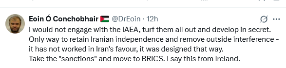 میں (اگر ایران کی جگہ ہوتا تو) عالمی جوہری توانائی ایجنسی (IAEA) کے ساتھ مزید مشغول نہ رہتا، ان سب کو نکال باہر کر دیتا اور خفیہ طور پر (جوہری ہتھیار) تیار کرتا۔ ایران کی آزادی کو برقرار رکھنے اور غیر ملکی مداخلت کو روکنے کا یہی واحد راستہ ہے – اس (این پی ٹی نے) اب تک ایران کے حق میں کچھ بھی نہیں کیا، (کیونکہ) اسے شروع سے ہی اس طرح سے ڈیزائن کیا گیا تھا۔