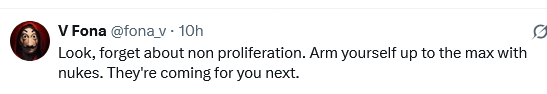 دیکھو، عدم پھیلاؤ (NPT) کو بھول جاؤ۔ خود کو زیادہ سے زیادہ جوہری ہتھیاروں سے لیس کرو۔ وہ اگلا حملہ تم پر کرنے آ رہے ہیں!