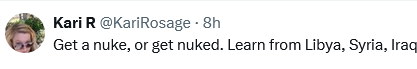 یہ سمجھ لیں کہ دنیا کمزور لوگوں کی جگہ نہیں، آپ کے تمام اتحادی (پاکستان، چین، روس اور مبینہ طور پر شمالی کوریا) ایٹمی طاقت ہیں اور انہوں نے (مغرب سے) اجازت کا انتظار نہیں کیا… انہوں نے خود فیصلہ کیا ہے! 👀