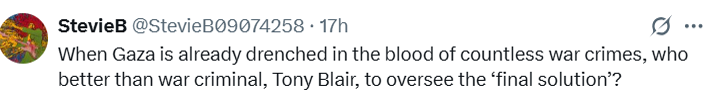 اس بات پر زور دیتے ہوئے کہ امریکی مشن کے لئے "جنگی مجرم” سے بہتر کون ہو سکتا ہے؟! ایک دوسرے صارف نے لکھا کہ جب غزہ جنگی جرائم کے باعث خون میں ڈو چکا ہے، تو پھر "جنگی مجرم ٹونی بلیئر” سے بہتر کون ہو گا کہ جو "حتمی حل” کے نفاذ کی نگرانی کر سکے؟