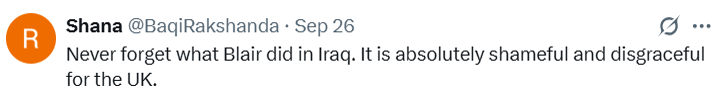 ایک دوسرے صارف نے عراق میں انجام پانے والے سابق برطانوی وزیراعظم کے جرائم کی جانب اشارہ کرتے ہوئے لکھا کہ بلیئر نے عراق میں جو کچھ کیا اسے کبھی نہ بھولیں، یہ برطانیہ کے لئے انتہائی شرمناک اور کلنک کا ٹیکہ ہے!