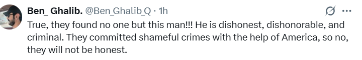 ایک دوسرے صارف نے لکھا کہ یہ بات بالکل ٹھیک ہے کہ (غزہ میں مزید جرائم کے ارتکاب کے لئے) اُنہیں اس شخص سے بڑھ کر کوئی نہ مل پایا!!! یہ شخص بے ایمان، بے وقار اور مجرم ہے۔ وہ امریکہ کی مدد سے شرمناک جرائم انجام دے چکے ہیں، لہذا، وہ کبھی ایماندار نہ ہوں گے!
