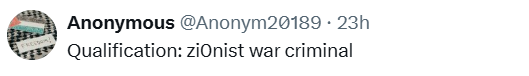 ایک دوسرے صارف ایک مرتبہ پھر اس انتخاب سے متعلق ٹونی بلیئر کی اہلیت پر سوال اٹھاتے ہوئے لکھا کہ قابلیت: صیہونی جنگی مجرم ہونا!