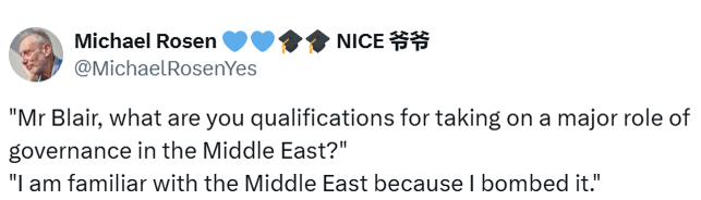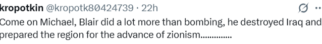 ایک دوسرے صارف کا بھی طنزیہ انداز میں لکھنا تھا کہ رہنے دو مچل… بلیئر نے بمباری سے بھی بڑھ کر بہت کچھ انجام دیا ہے، اس نے عراق کو تباہ کر ڈالا اور خطے بھر کو صیہونی پیشقدمی کے لئے تیار کیا..